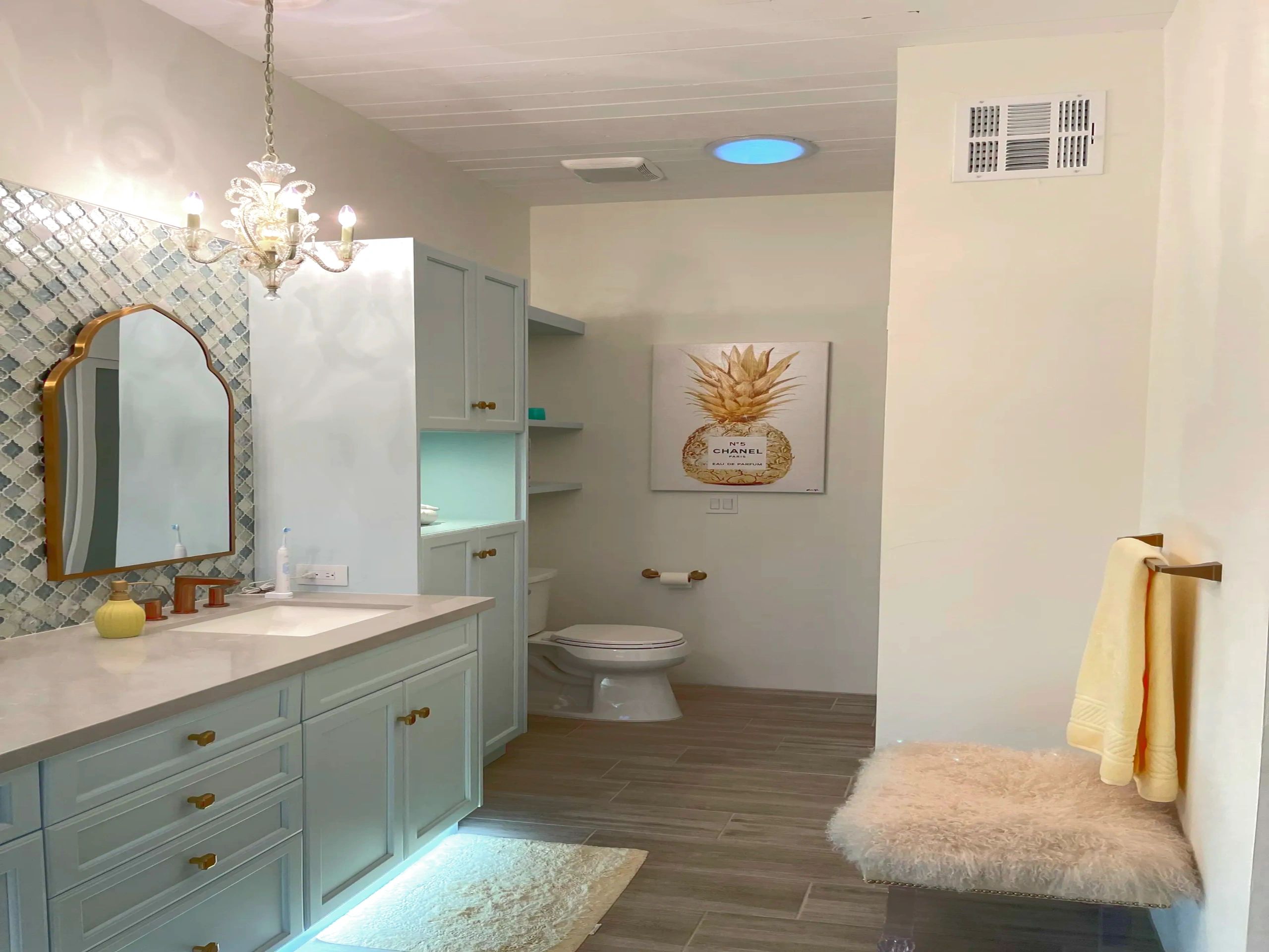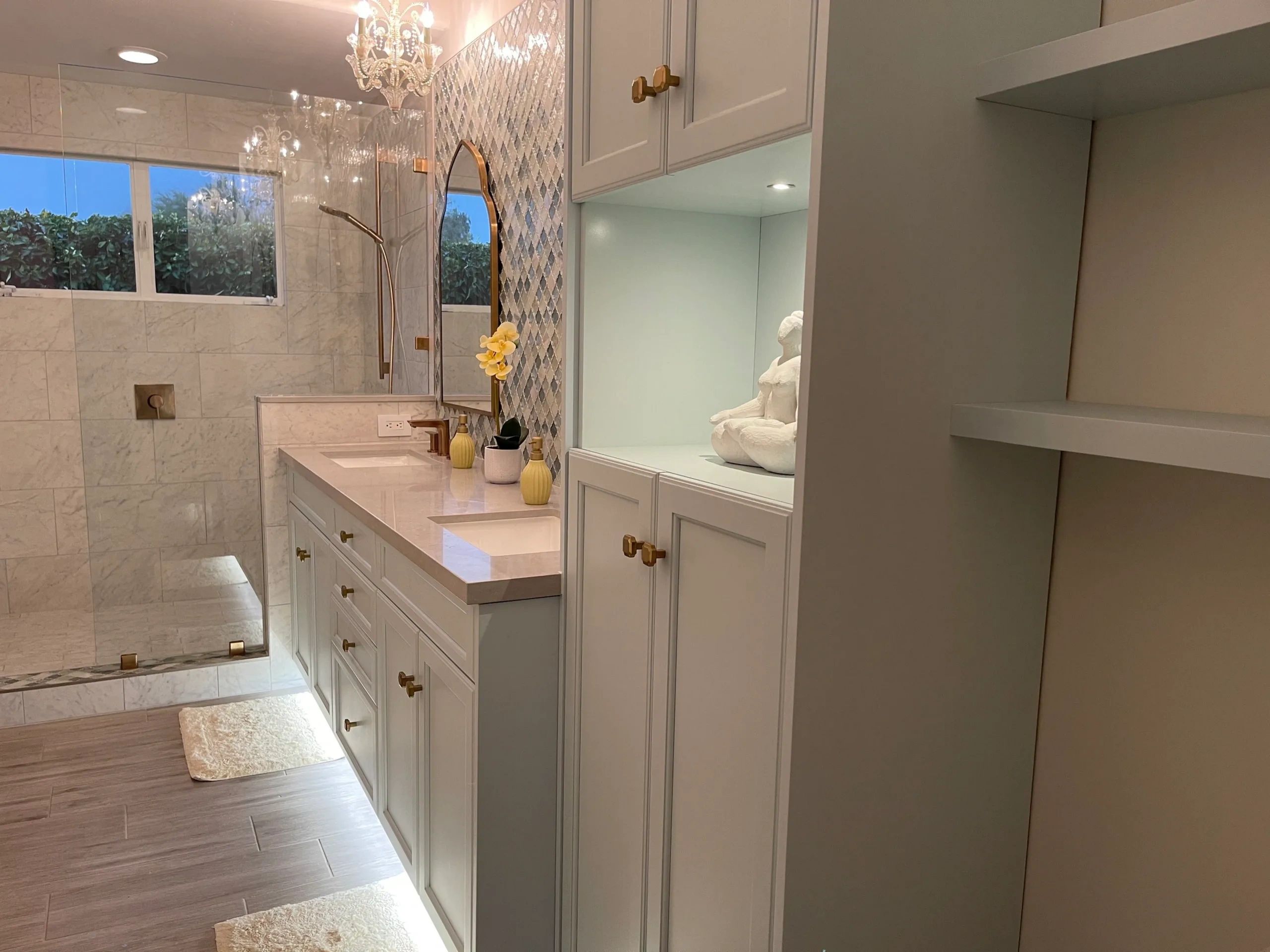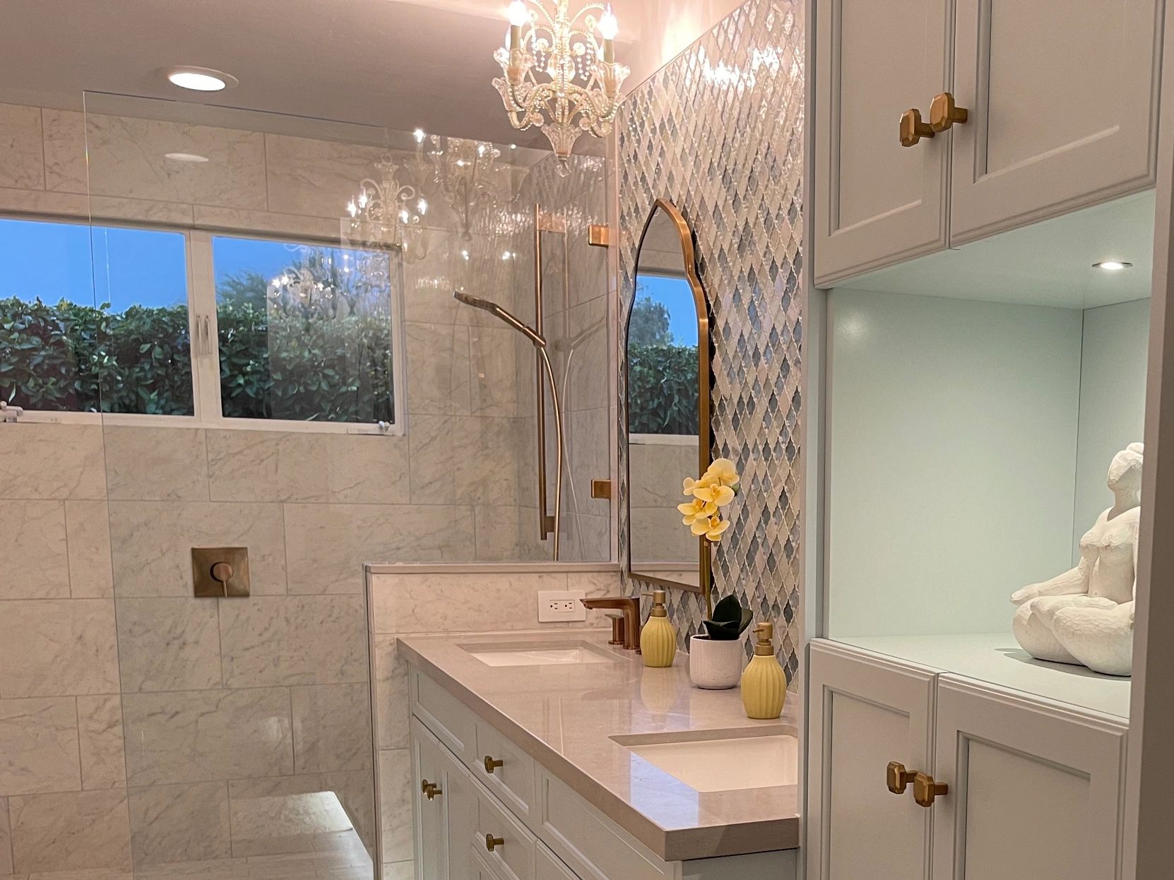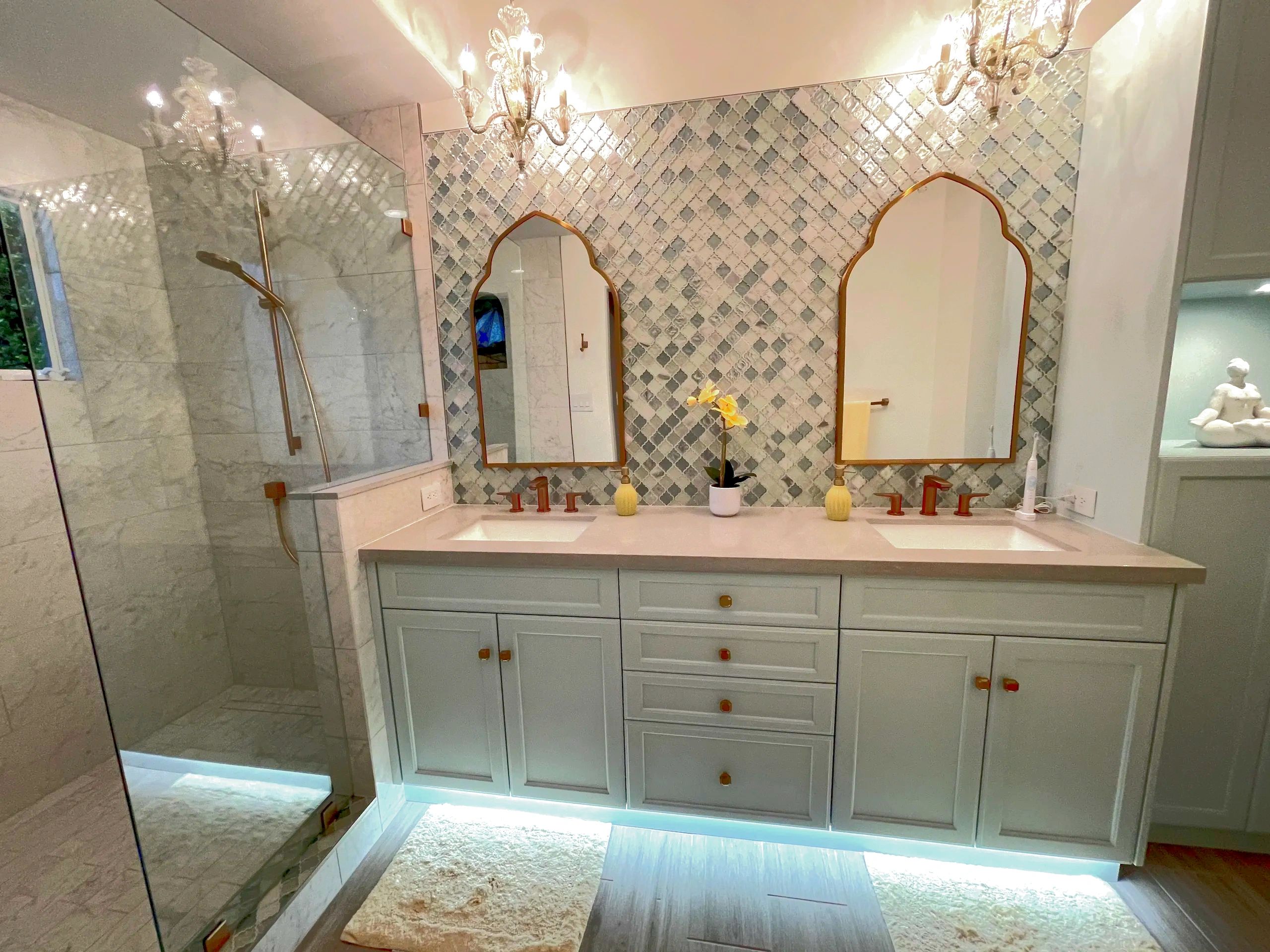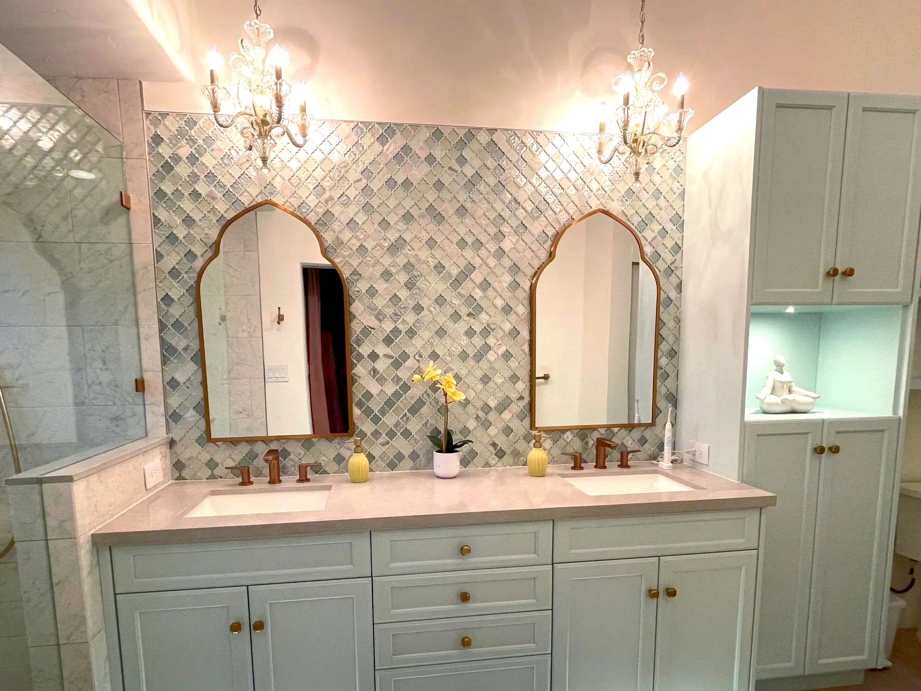 Take a step into this dreamy and tranquil space inspired by Moroccan patterns and spa like feels. Warm metals contrast the beautifully serene color pallet to bring this concept to life!