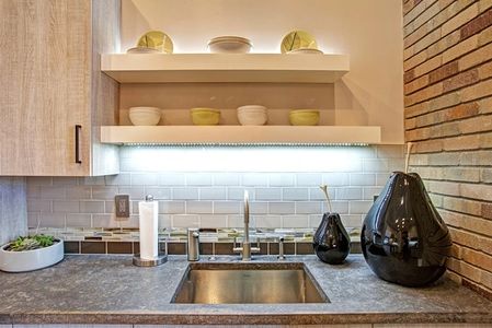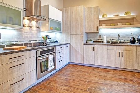 Bellmont Cabinetry's frameless construction, styled in the aluminum framed, high-gloss lacquer door and texured laminate. Thick floating shelves provide easy access for common items in the kitchen.